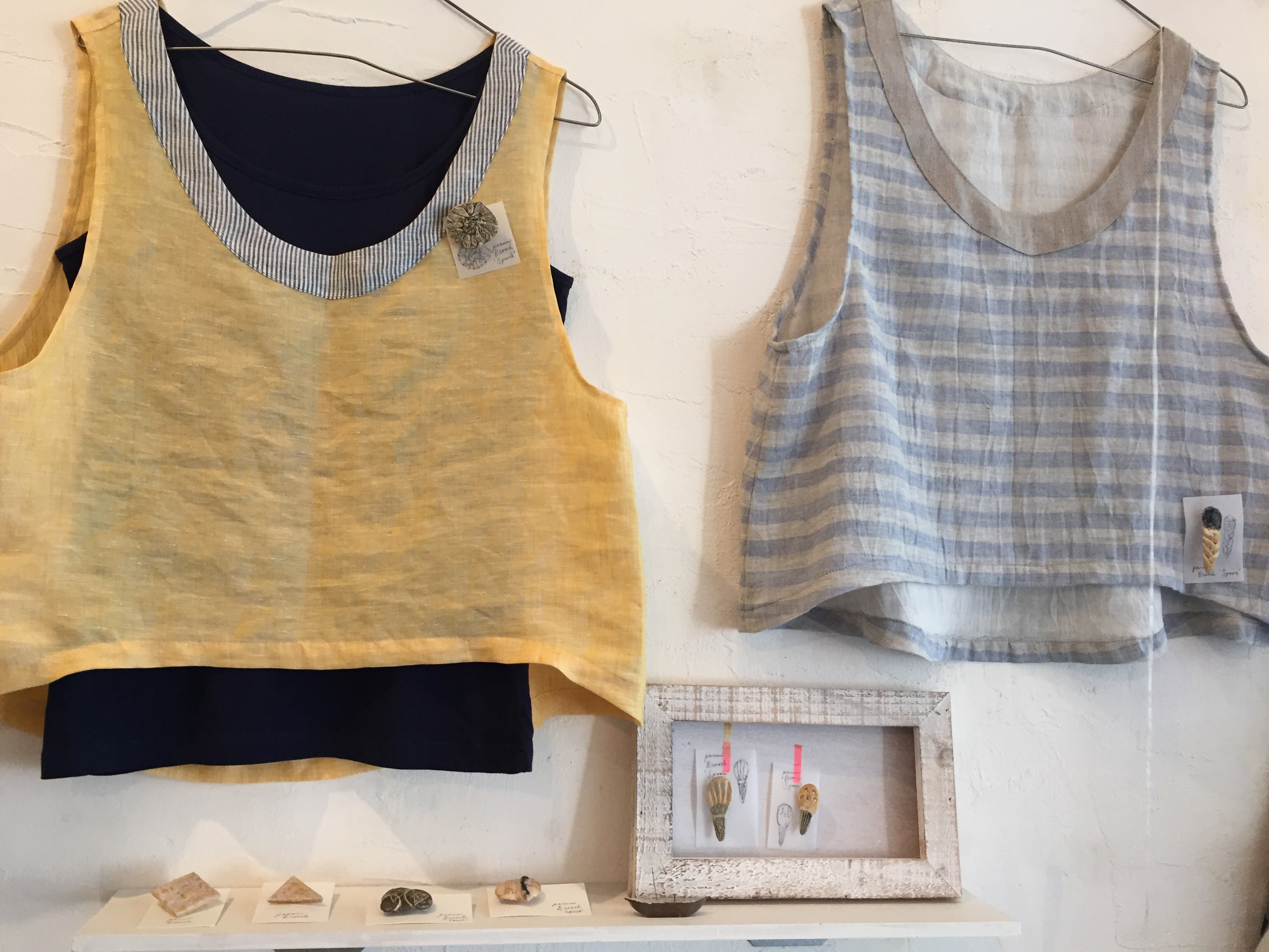 短めのタンクトップに重ね着して、ブローチも合わせてもらっています。私はスプーンモチーフでお題をもらったので、一本ずつスプーンを考えながら作りました。あとは夏をイメージしたものを。