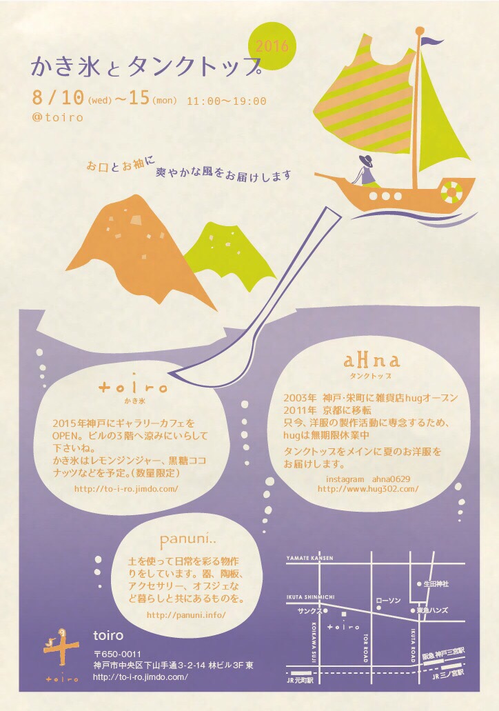 toiroさんがオープンしてからは、私にとっては初めての展示で少しドキドキします。京都のhugさんの作るタンクトップに、toiroさんのかき氷、私はスプーンをイメージした小物で、夏を感じる展示の仲間入りをさせていただけたら嬉しいです。みなさま、暑い夏真っ盛りですが、数量限定のかき氷をぜひ食べに行ってくださいね!