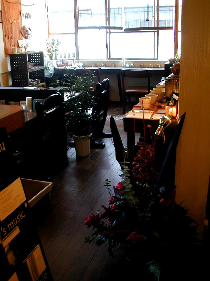 展示風景 2006/11/10 カテゴリ:イベント コフクカフェ入り口からの 展示風景です 大きなお花のアレンジを 初日にいただきました お昼間は店内にたくさんの 光がさしこみます 夜になるとライトの光と 外の色とがまじりあい 作品たちがまた違った 顔を見せてくれます